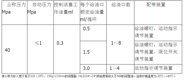 本系列分配器上面和下面均有出油口,分配器活塞正反向動(dòng)作一個(gè)工作循環(huán)分別從上面和下面給油一次。有三種給油系列,并具有帶給油螺釘,帶運動(dòng)指示調節裝置和帶限位開(kāi)關(guān)調節裝置三種形式。在上面和下面對應的出油口間預制有合并上下二出口為一個(gè)出口的螺釘,易改為奇數出油口,方便得到倍量的潤滑油,使系統配管簡(jiǎn)單。同樣出油口分配器的外形安裝尺寸相同,易于型號更換、替換。