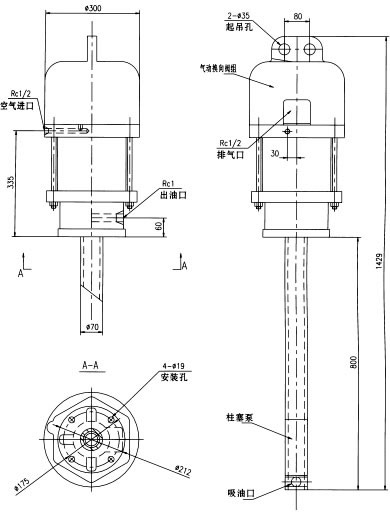 1、以托架(用戶(hù)自備)作支承,用四只M16的螺栓把氣動(dòng)泵固定在托架上,柱塞泵管垂直插入貯油箱的油脂中。