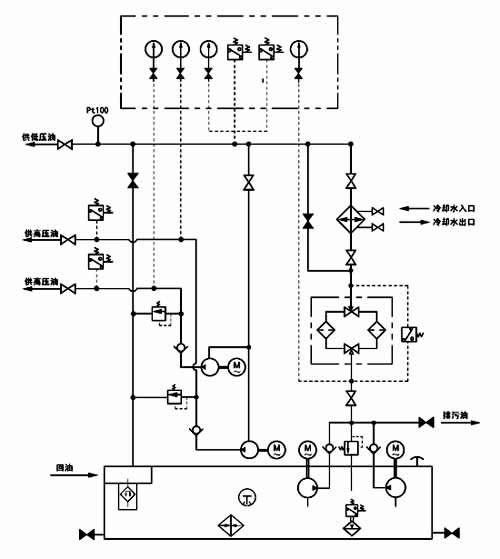 稀油站二根高壓輸出管道的壓力均為31.5MPa,流量各為2.5L/min,低壓部分的壓力為0.4MPa,低壓流量為16~100L/min;稀油站具有過(guò)濾、冷卻、加熱等裝置和聯(lián)鎖、報警、自控等功能。
