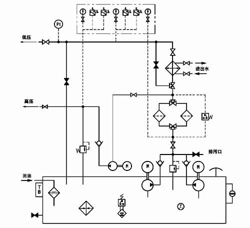 稀油站的高壓部分壓力為31.5MPa,流量為2.5L/min,低壓部分壓力為0.4MPa;流量為16~125L/min,稀油站具有過(guò)濾、冷卻、加熱等裝置和聯(lián)鎖、報警、自控等功能。