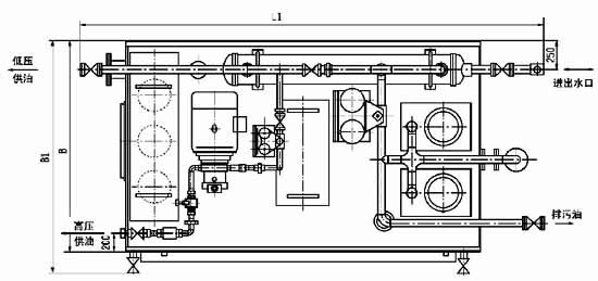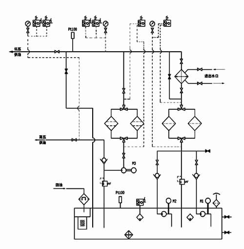 本油站為整體式,由油箱、兩臺低壓油泵、一臺高壓油泵、二臺雙筒網(wǎng)片式過(guò)濾器、回油磁網(wǎng)過(guò)濾裝置、列管式油冷卻器、各種控制閥門(mén)、管道以及電接點(diǎn)壓力表、鉑熱電阻等組成。
